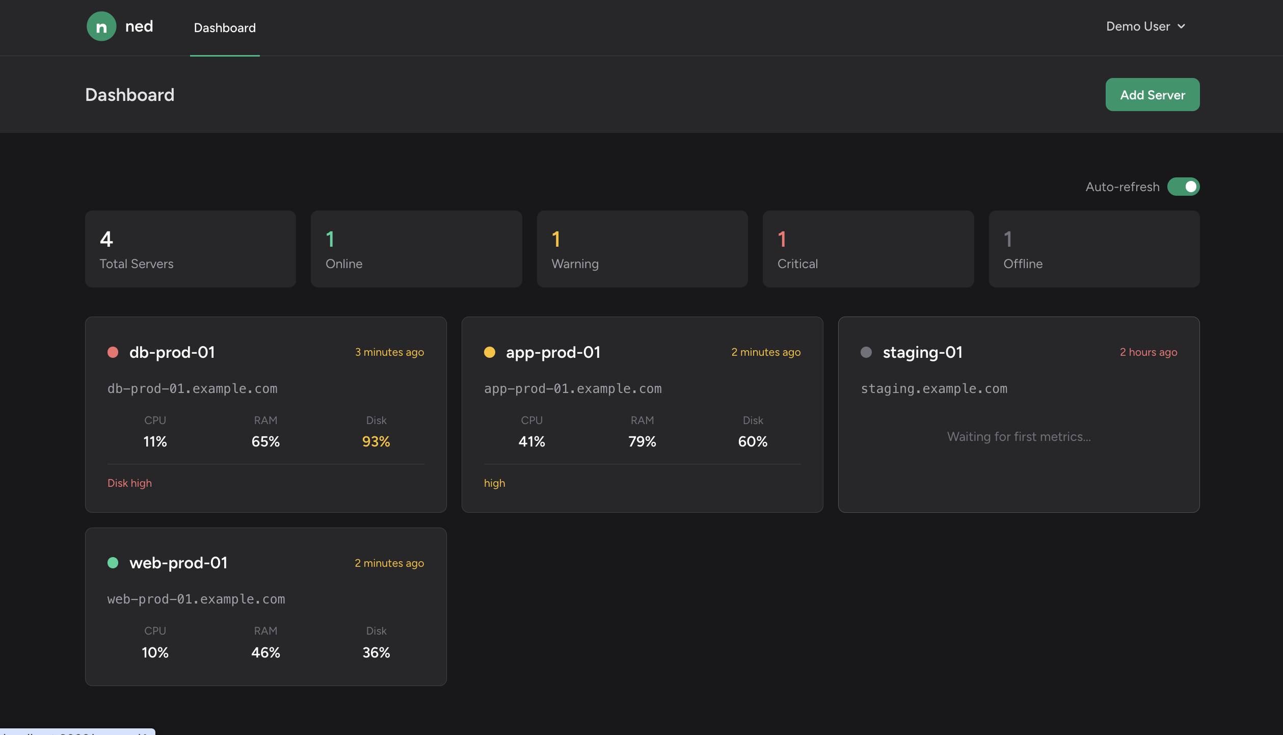 See all your servers at a glance with status indicators and key metrics.