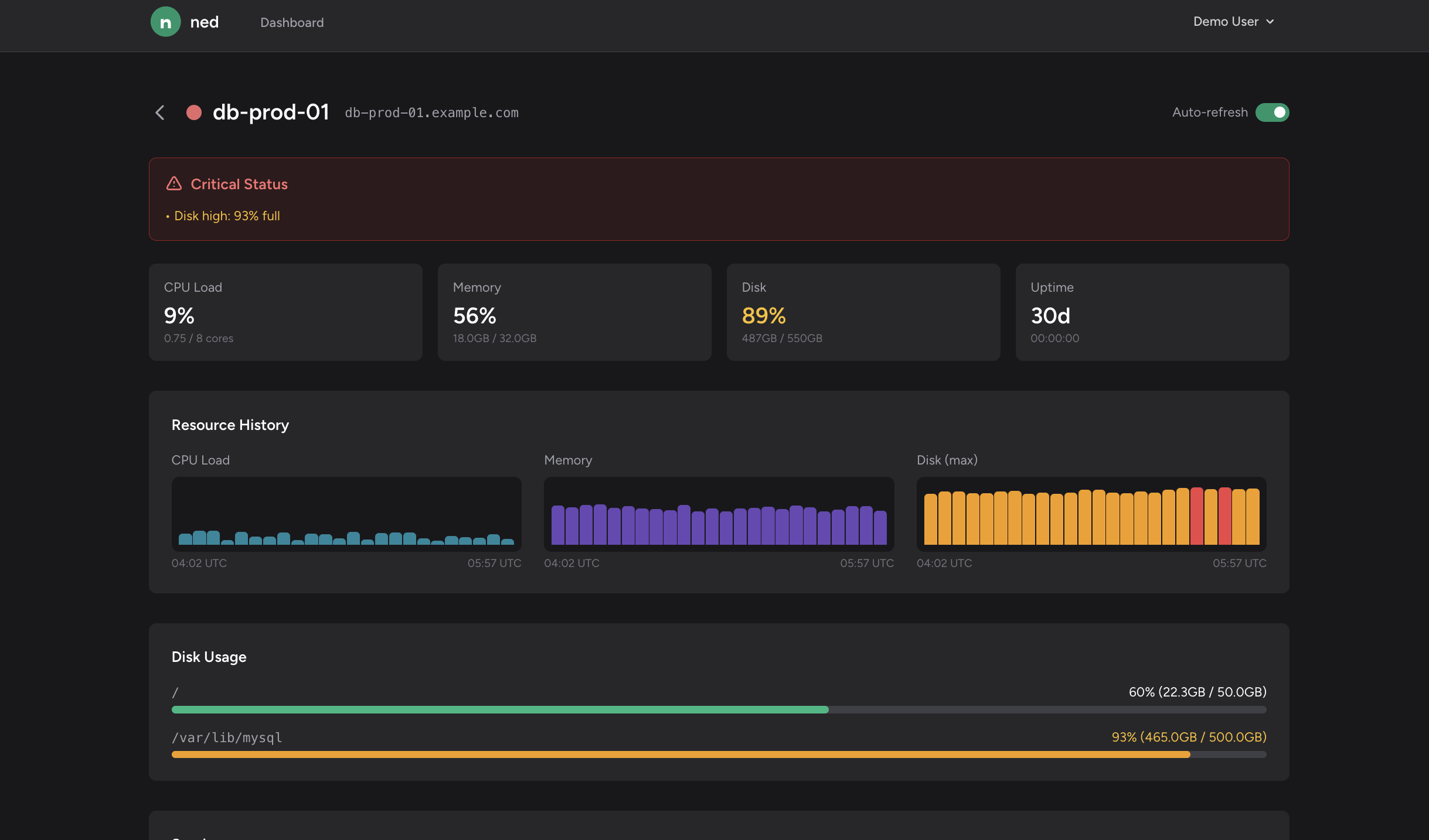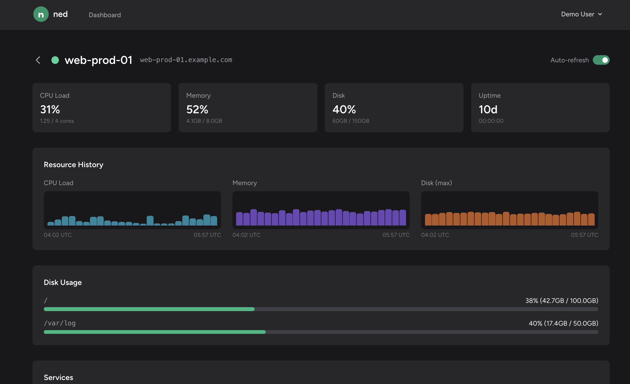 Dive into individual server metrics with resource history charts, disk usage, and service status.